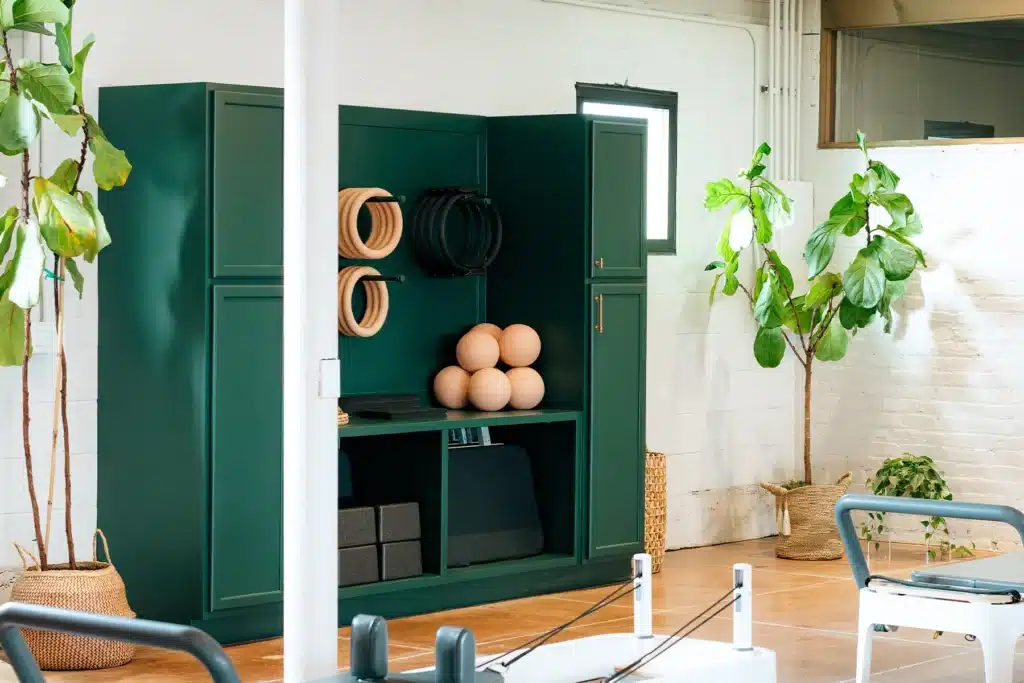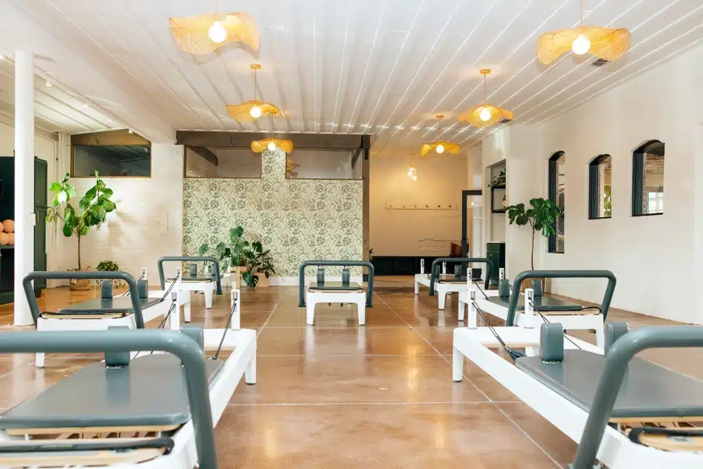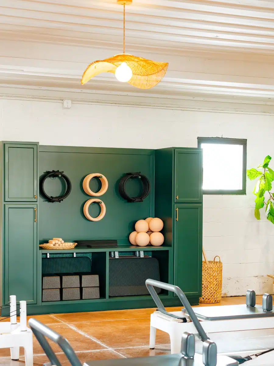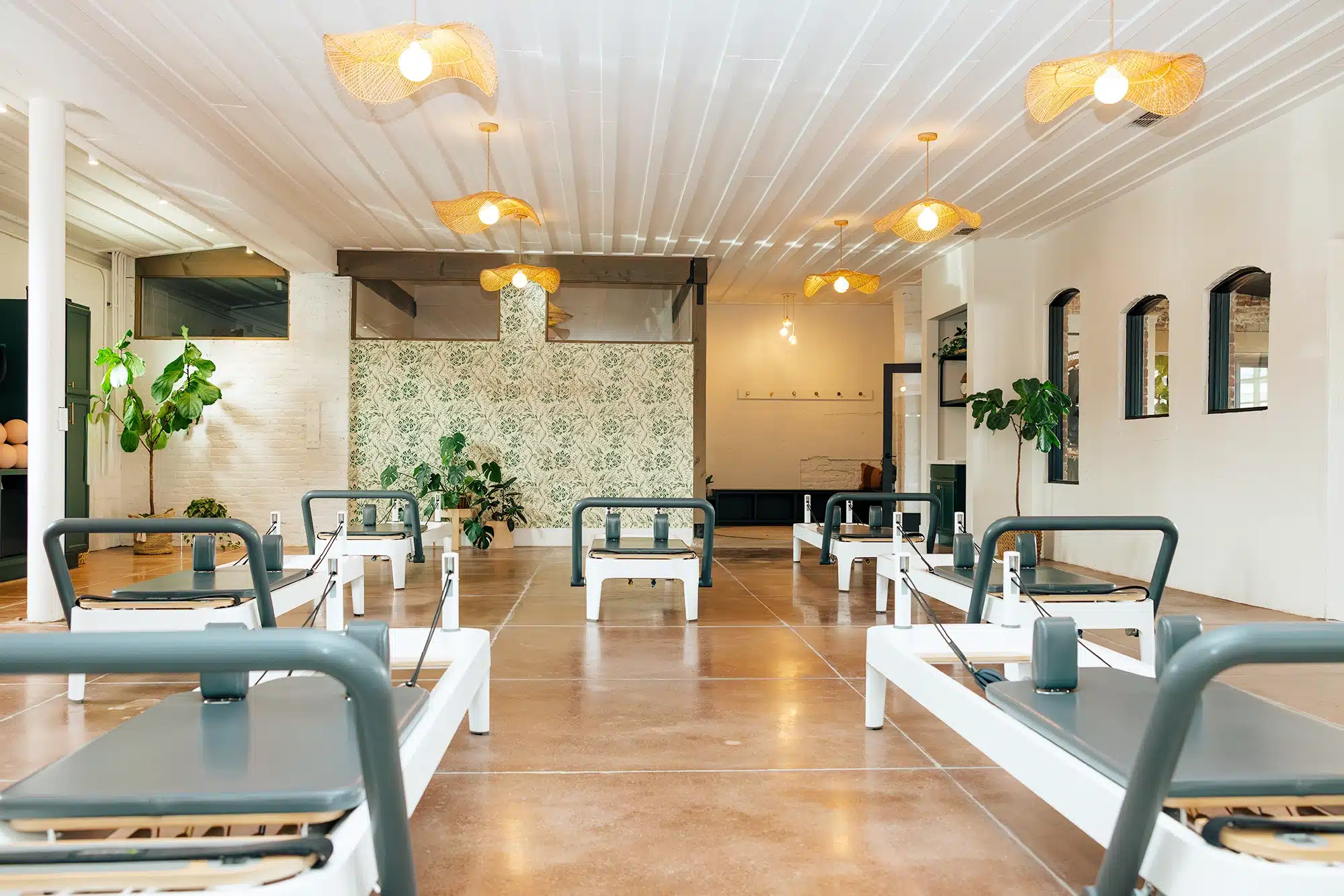 The studio features Balanced Body reformers, custom storage and prop displays, natural materials, and soft architectural lighting. Large windows and warm textures create a grounded, inviting environment distinct from traditional fitness spaces.